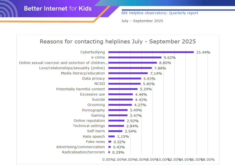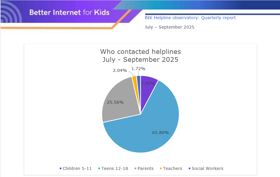 Κατά το τρίμηνο Ιουλίου–Σεπτεμβρίου 2025, οι Γραμμές Βοήθειας του δικτύου Insafe κλήθηκαν να υποστηρίξουν πάνω από 14.300 παιδιά, εφήβους και γονείς. Παρά τη μικρή μείωση σε κλήσεις λόγω της καλοκαιρινής περιόδου, τα περιστατικά που αναφέρονται παραμένουν ιδιαίτερα ανησυχητικά και αποκαλύπτουν τις πραγματικές προκλήσεις που αντιμετωπίζουν οι νέοι στο διαδίκτυο.