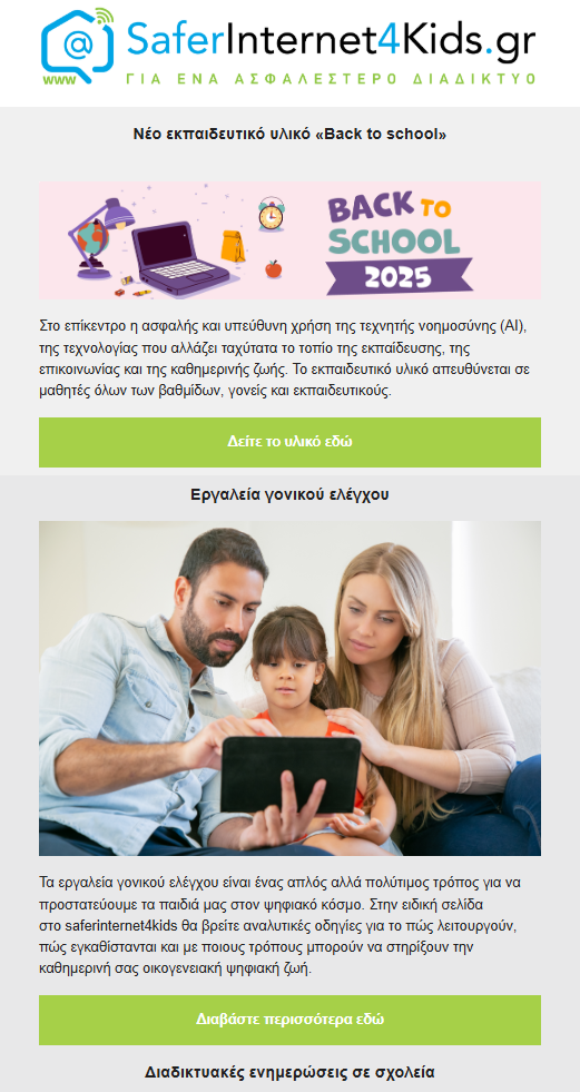 Παράλληλα, θα ενισχυθούν οι πόροι και η επιμόρφωση για τα σχολεία μέσω του δικτύου Κέντρων Ασφαλούς Διαδικτύου και της ευρωπαϊκής πλατφόρμας «Βetter Internet For Kids».