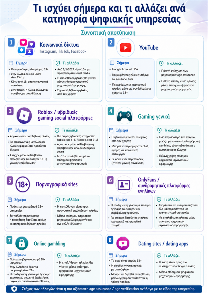 Οι εξελίξεις αυτές αποτυπώνονται με σαφήνεια στις διαφορετικές προσεγγίσεις που εφαρμόζονται ήδη ή διαμορφώνονται. Τα κοινωνικά δίκτυα βρίσκονται στο επίκεντρο αυξανόμενης πίεσης για την υιοθέτηση αυστηρότερων ηλικιακών ορίων και πιο αξιόπιστων μηχανισμών επαλήθευσης. Το YouTube, ως πλατφόρμα διαμοιρασμού βίντεο, αντιμετωπίζεται ως διακριτή κατηγορία με ειδικούς κανόνες προστασίας. Παράλληλα, πλατφόρμες όπως το Roblox αναπτύσσουν ήδη εσωτερικά συστήματα ηλικιακής διαβάθμισης, συνδέοντας την ηλικία με την πρόσβαση σε περιεχόμενο και λειτουργίες επικοινωνίας. Τέλος, οι υπηρεσίες που απευθύνονται αποκλειστικά σε ενήλικες, όπως το διαδικτυακό gambling, η πορνογραφία και οι εφαρμογές γνωριμιών, κινούνται ολοένα πιο ξεκάθαρα προς την κατεύθυνση της ουσιαστικής επιβεβαίωσης ηλικίας, είτε κατά την εγγραφή είτε πριν από την πρόσβαση σε ευαίσθητες λειτουργίες.